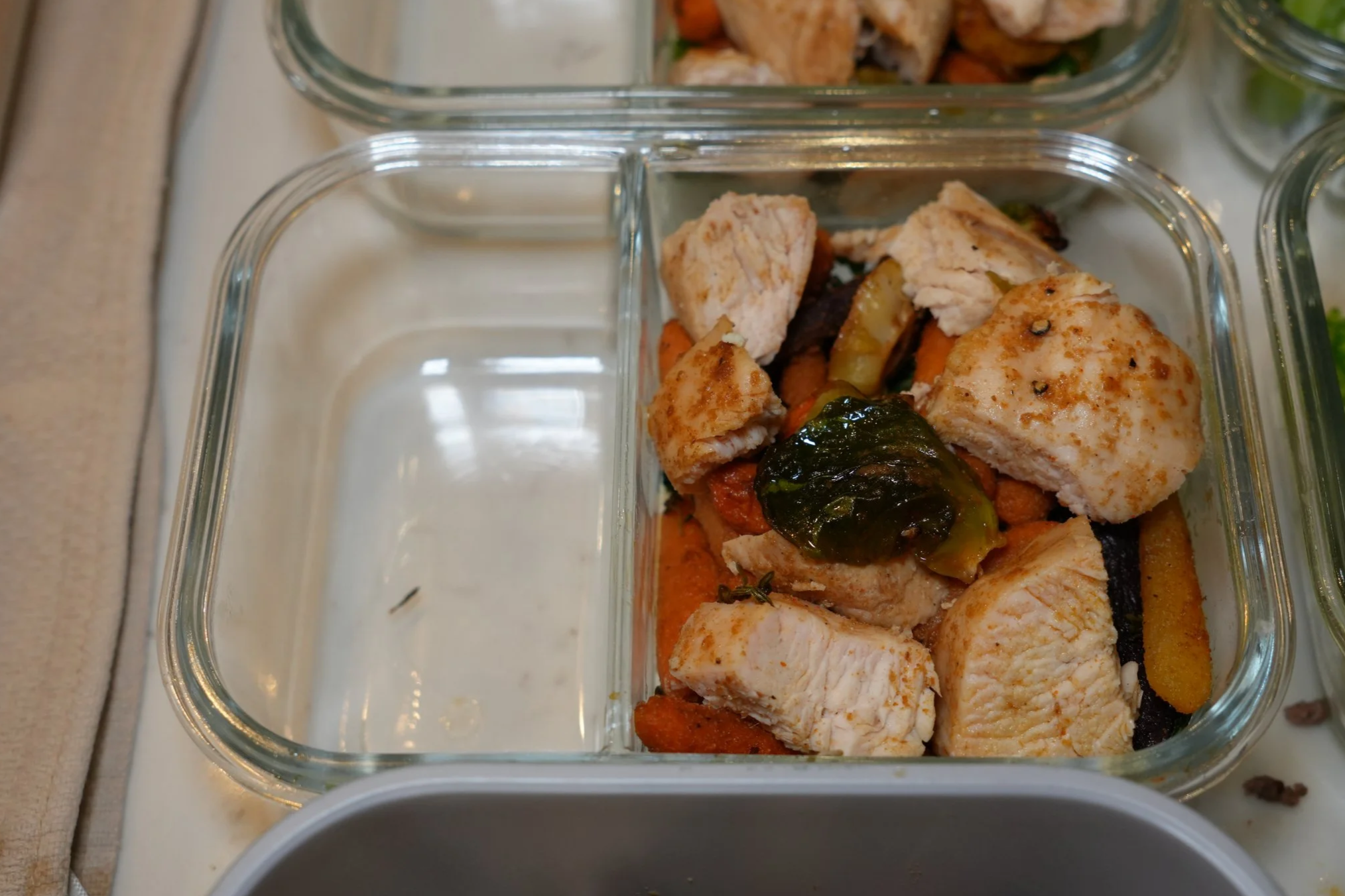 To assemble, spread whipped feta in the bottom of each meal prep container. Top with roasted carrots, brussels sprouts, kale, and sliced chicken.